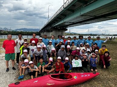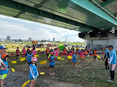 まずは陸上で、カヌー協会の方から漕ぎ方・乗り方・転覆時の対応など丁寧にレクチャー。 参加者のおよそ半分がカヌー初体験!上手にこげるかな?