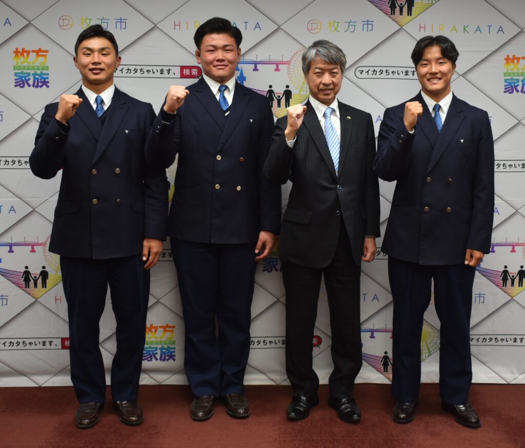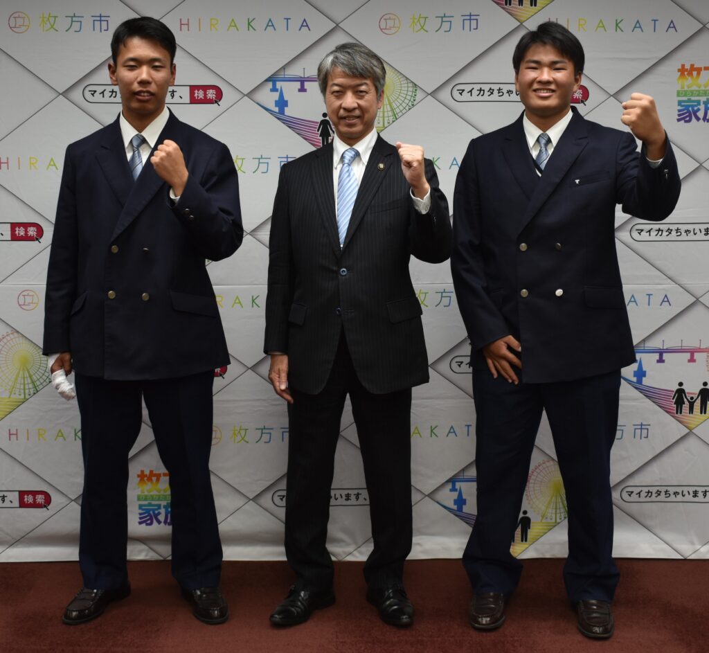 伏見市長は「日頃からの厳しい練習の成果が出せたのかなと思います。中等部は次のステージに行かれても頑張っていただきたい。高等部はノーシードということで、1回戦から強豪校と戦う恐れもありますが、1戦1戦厳しい戦いを勝ち抜き頑張ってきてほしいと思います。優勝を目指して頑張れ!」とエールを送りました。また、今年のチームはどんなチームと聞かれ東選手は「今年はエース級の選手はいないが、チーム一丸となって戦うチーム。今年はどのチームと飛び出したチームのいない混戦。昨年、一昨年と桐蔭学園に負けているのでリベンジを果たしたい」と話してくれました。抽選会は12月6日。枚方からエールを送りましょう!