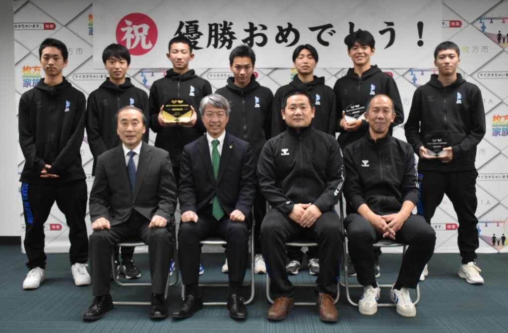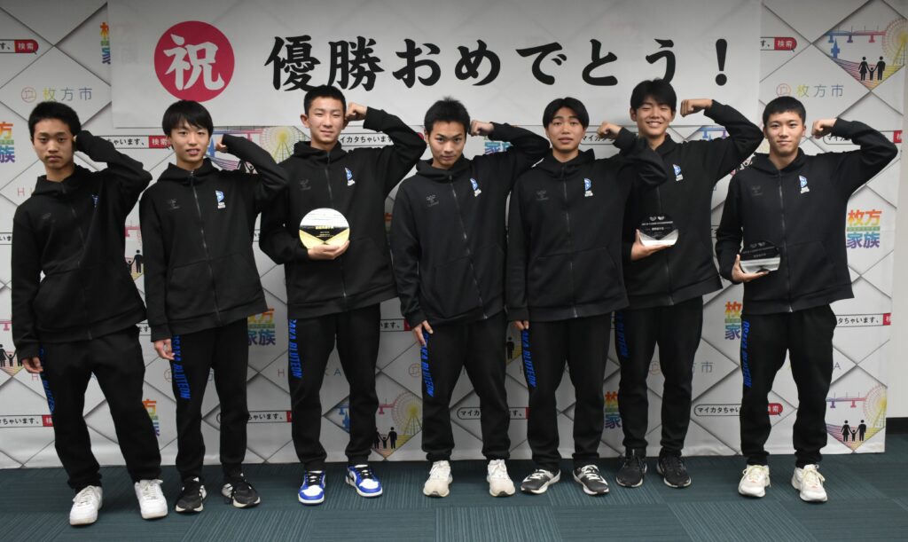 市内で活動する大阪ブルテオンU15が、令和7年10月11日~12日に開催されました「2025SV-V.LEAGUE U15 CHAMPIONSHIP予選」においてPOOL C を1位で通過し、11月15日~16日に開催されました「2025SV-V.LEAGUE U15 CHAMPIONSHIP」の決勝トーナメントにおいて見事優勝し、前回のヤングバレーボール大会に続き二冠を達成したため、市長へ報告を行いました。